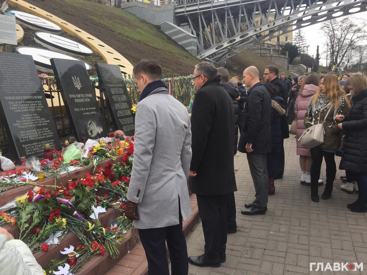 Послы из Польши, Болгарии, Чехии, Эстонии, Литвы, Латвии, Румынии, Словакии и Венгрии пришли на Аллею Героев Небесной Сотни и возложили цветы и венки к Стеле памяти.