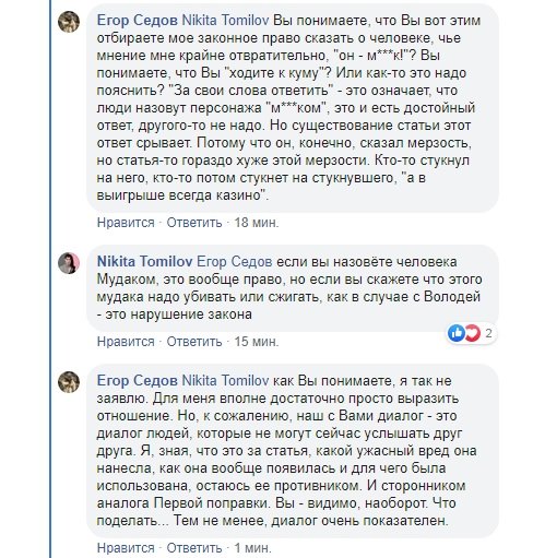 Потому что у меня отнимают моральное право высказаться о неприятном мнении как о мнении м***ка (это и есть «ответить за слова» — когда люди вокруг назовут говорящего м***ком). Меня зачем-то заставляют высказываться в защиту (всё по Вольтеру, конечно) человека, который мне неприятен. Потому что, какую бы мерзость он ни сказал, 282-я все равно хуже и гаже.