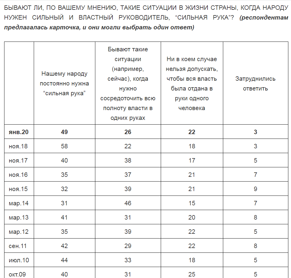 Три четверти россиян (75%) высказались за то, чтобы Россией правил сильный и властный лидер. Из них 49% убеждены в том, что страна постоянно нуждается в "сильной руке", поскольку не выживет без нее.