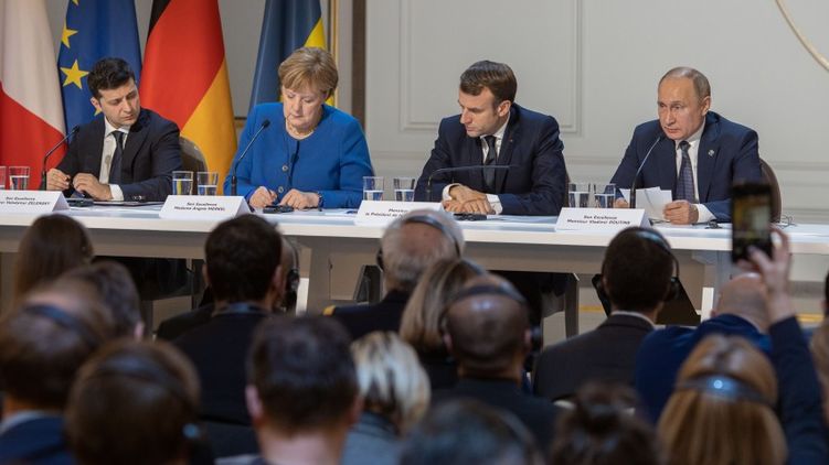 [Фотография с пресс-конференции после встречи в рамках «нормандского формата». Подпись: «[Зеленский] с Ангелой Меркель, Эммануэлем Макроном и Владимиром Путиным в Париже в декабре».]