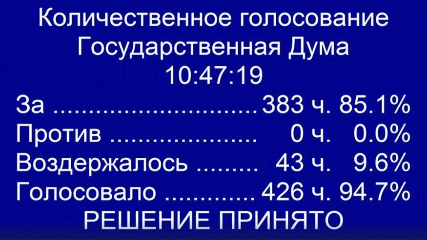 За выступили 383 парламентария, при этом никто не решился проголосовать против. Еще 43 человека воздержались.