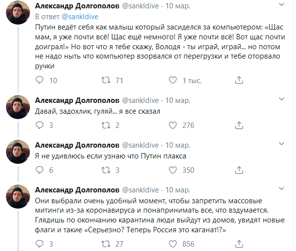 Российский стендап-комик Александр Долгополов сравнил главу РФ с капризным ребенком, который засиделся за компьютером. Таким образом он отреагировал на решение Путина поддержать идею об обнулении президентский сроков. Своей реакцией Долгополов поделился на странице в Twitter.