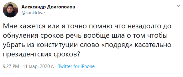 «Мне кажется или я точно помню, что незадолго до обнуления сроков речь вообще шла о том чтобы убрать из конституции слово «подряд» касательно президентских сроков?», — поделился своим Долгополов.