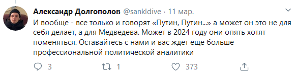 «Все только и говорят «Путин, Путин…». А может он это не для себя делает, а для Медведева. Может в 2024 году они опять хотят поменяться. Оставайтесь с нами, и вас ждёт ещё больше профессиональной политической аналитики», — пошутил комик.