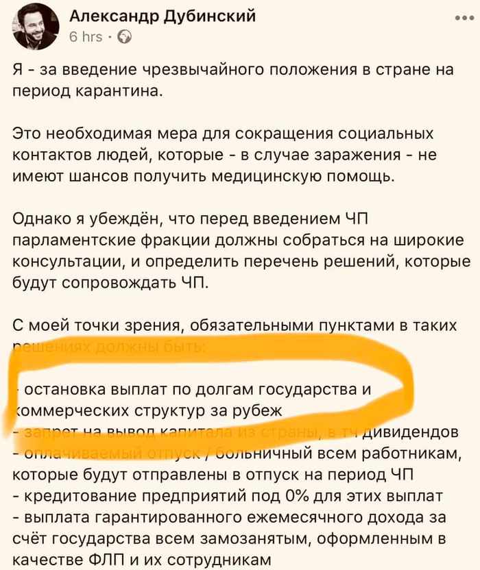 Дубинский не настолько туп, чтобы открыто написать, что он требует дефолта. Народ это как-то не оценит.