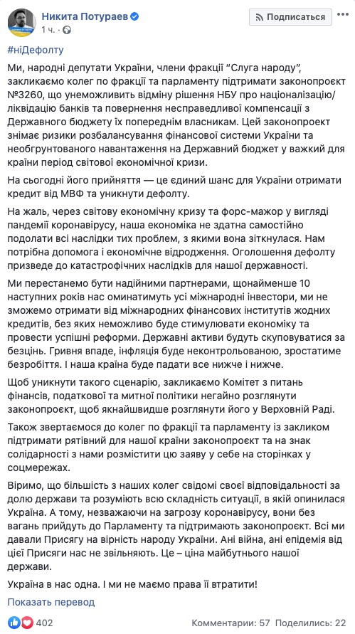 «Хорошие новости — внутри фракции «Слуга народа» в Раде формируется группа людей, которые выступают против сценария Коломойского. Сегодня они все шерят пост в фейсбуке с хэштегом #ніДефолту («нет дефолту»), где требуют принять закон о невозврате национализированных банков бывшим владельцам, а также призывают комитет его срочно рассмотреть (в этот комитет входит Дубинский). Также обещают прийти и проголосовать этот закон в Раде вопреки эпидемии», — написал он.
