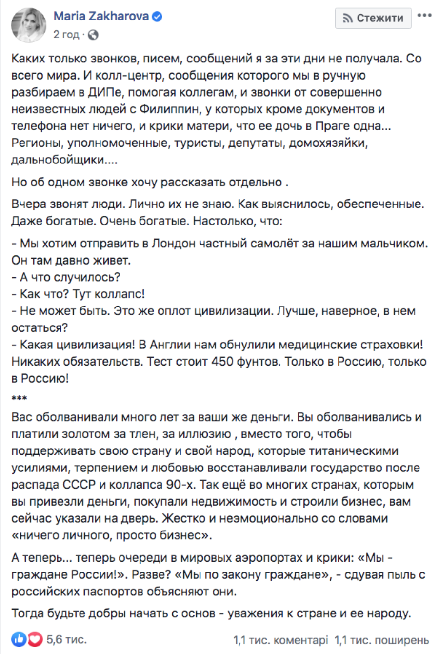 "Каких только звонков, писем, сообщений я за эти дни не получала. Со всего мира. И колл-центр, сообщения которого мы в ручную разбираем в ДИПе, помогая коллегам, и звонки от совершенно неизвестных людей с Филиппин, у которых кроме документов и телефона нет ничего, и крики матери, что ее дочь в Праге одна... Регионы, уполномоченные, туристы, депутаты, домохязяйки, дальнобойщики....