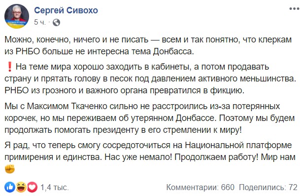 Напомним, 12 марта в Киеве представители националистических сил сорвали презентацию Национальной платформы примирения и единства, которую проводил Сивохо. Они были возмущены тем, что советник секретаря СНБО назвал войну на Донбассе «внутренним конфликтом». Националисты устроили ссору, во время которой толкнули Сивохо.