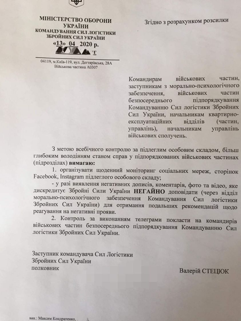 В том случае, если будут обнаружены «негативные посты, комментарии, фото и видео, дискредитирующие ВСУ», командиры должны доложить Командованию сил логистики.
