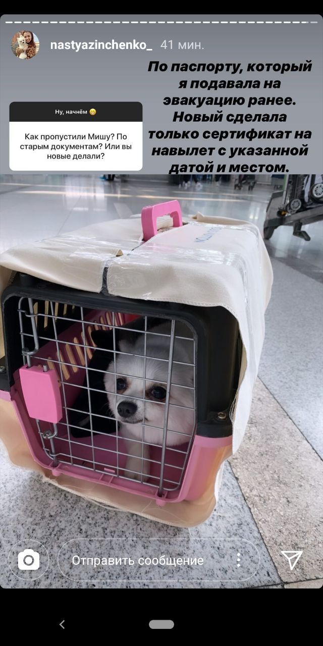 На вопрос, как ей удалось вылететь с собакой, Анастасия ответила, что воспользовалась паспортом, который в феврале подавала на эвакуацию.
