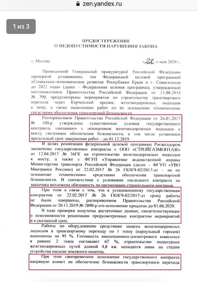 "Интересные движения происходят по вопросам открытия пассажирского железнодорожного сообщения по "Керченскому мосту". 22 мая 2020 Генпрокуратура РФ подала "предостережение" главе Федерального агентства железнодорожного транспорта о нарушении законодательства при строительстве железнодорожного перехода через Керченский пролив. Такое неожиданную заявление начали распространять и российские СМИ", - сказано в публикации.