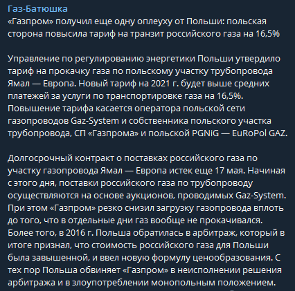 Тариф на транзит российского газа по польскому участку трубопровода Ямал — Европа увеличен на 16,5%. Как пишет Телеграмм-канал Газ-Батюшка, этот шаг можно назвать оплеухой от Польши, которую получил "Газпром".