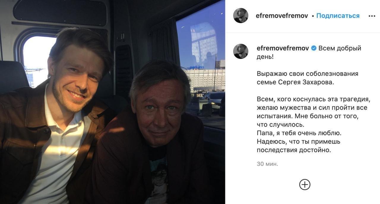 Также впервые высказался о ДТП сын Михаила Ефремова - Никита. Он попросил прощения у семьи погибшего в аварии Сергея Захарова и поддержал отца.