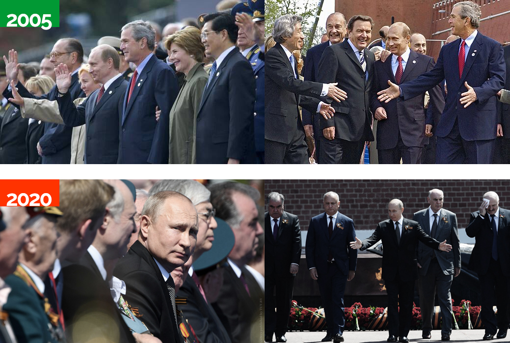 "Печальный результат войны с цивилизованным миром: превратив себя в изгоя, принимаешь парад Победы не с мировыми лидерами, а с черт знает кем. Ну и поделом", - комментирует фотографии автор коллажа.