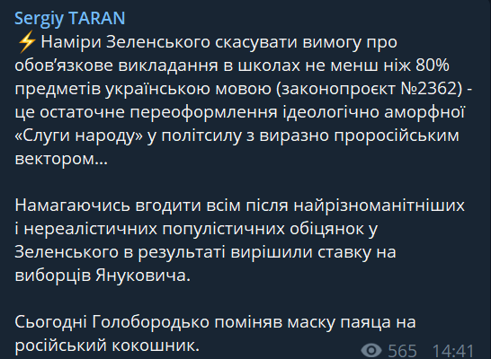 По словам Тарана, политическая партия "Слуга народа" ранее была идеологически аморфной, но сейчас же превращается в политическую силу с ярко выраженным пророссийским вектором.