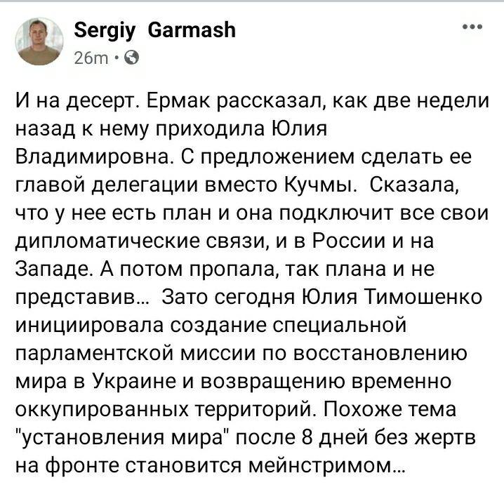 "И на десерт. Ермак рассказал, как две недели назад к нему приходила Юлия Владимировна. С предложением сделать ее главой делегации вместо Кучмы. Сказала, что у нее есть план и она подключит все свои дипломатические связи, и в России и на Западе. А потом пропала, так плана и не представив... Зато сегодня Юлия Тимошенко инициировала создание специальной парламентской миссии по восстановлению мира в Украине и возвращению временно оккупированных территорий. Похоже тема "установления мира" после 8 дней без жертв на фронте становится мейнстримом...", - отметил Гармаш на своей странице в соцсети.