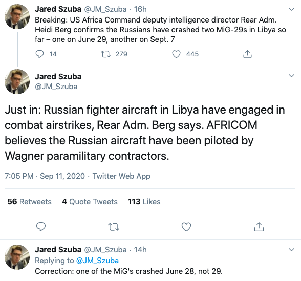 Со слов военного, в последние месяцы РФ потеряла в Ливии два МиГ-29. Первый был разбит 28 июня, второй совсем недавно - 7 сентября. Он уточнил, что, по данным разведки США, пилотируют российские истребители боевики ЧВК "Вагнер", нанося удары по позициям правительственных войск.
