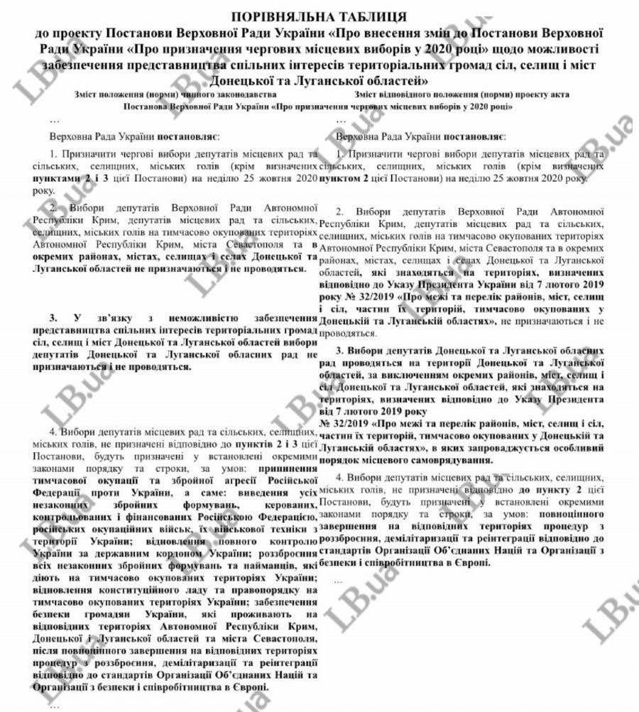 «Сейчас выборы в Луганский и Донецкий областные советы проводиться не должны, потому что значительная часть этих областей оккупирована. Проектом предлагается выборы в облсоветы все равно провести. Кроме оккупированных территорий, где устанавливается «особый порядок» местного самоуправления.