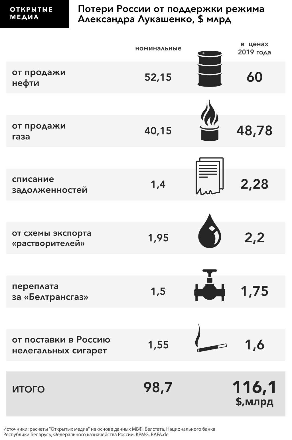Cуммарные потери России на поддержку белорусской экономики за последние 25 лет, на протяжении которых страной управляет Александр Лукашенко, составляют как минимум $98,7 млрд в номинальных цифрах, а с учётом инфляции, в ценах 2019 года – $116,1 млрд