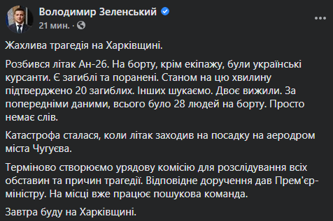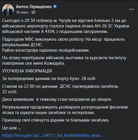 «Самолет разбился при заходе на посадку. Кроме экипажа, на борту самолета находились курсанты Харьковского университета Воздушных Сил ВС Украины. Есть погибшие и травмированные», — говорится в сообщении.