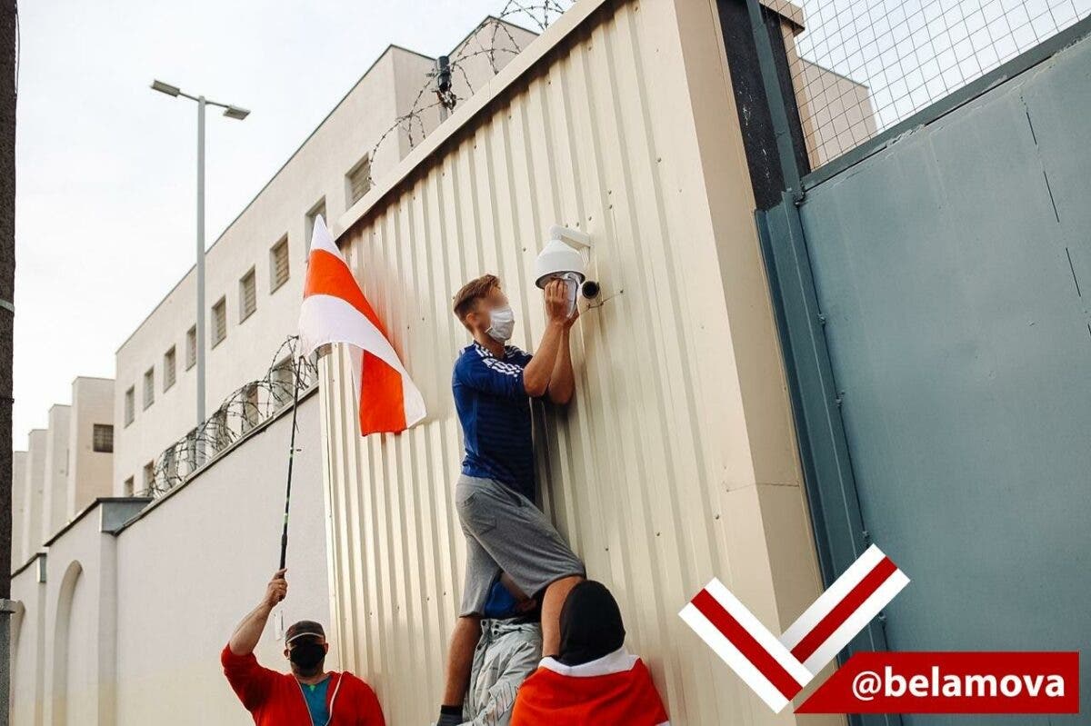Колонна протестующих прошла по городу к зданию следственного изолятора на Окрестино, где после протестов в августе избивали и пытали людей. В изоляторе и сейчас содержатся десятки политических заключенных, которые были задержаны за участие в протестном движении последних месяцев.