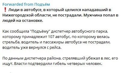«Подъем» отмечает, что пассажиры автобуса, в который целился нападавший, не пострадали. Парень попал в людей на остановке.