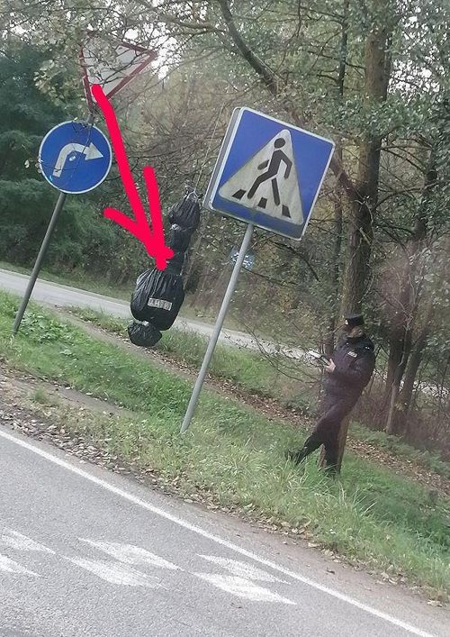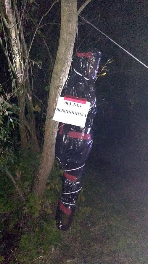 С помощью мусорных пакетов люди сооружают чучела силовиков и развешивают их на деревьях в разных местах города Брест. Некоторые из них снабжены надписями.