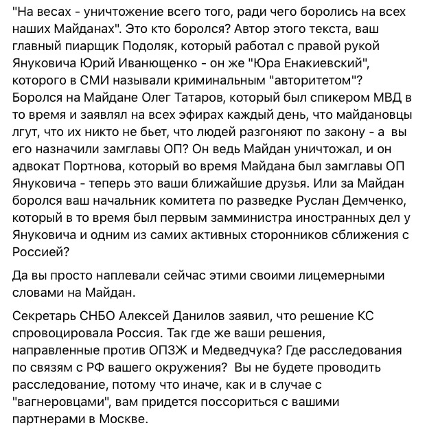 "А разве Коломойский не остается вашим политическим союзником? Разве ваш первый помощник Шефир не продолжает ездить в его офис на доклады? Разве не вы отдали под контроль Коломойского Киевскую областную организацию Слуг народа?