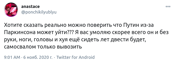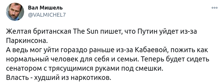 5 ноября российский профессор Валерий Соловей сделал такое же предположение, обратив внимание на симптомы болезни Паркинсона у главы РФ. Соловей утверждает, что на отставке Путина настаивает не только Кабаева, но и его дочери. По информации политолога, планы о передачи власти будут озвучены уже в январе.