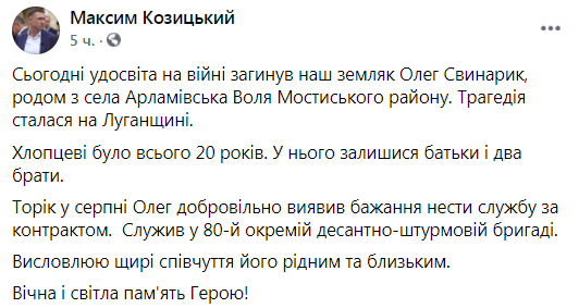 Известно, что Свинарик родился в селе Арламовская Воля Львовской области. В августе прошлого года он добровольно пошел на службу по контракту.