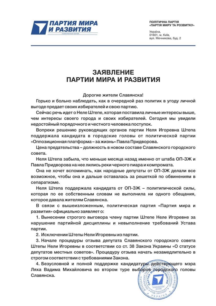 «Партия мира и развития» исключила из своего состава бывшую городскую голову Славянска Нелю Штепу и начала процедуру лишения ее мандата депутата Славянского городского совета. Об этом говорится в заявлении политсилы.