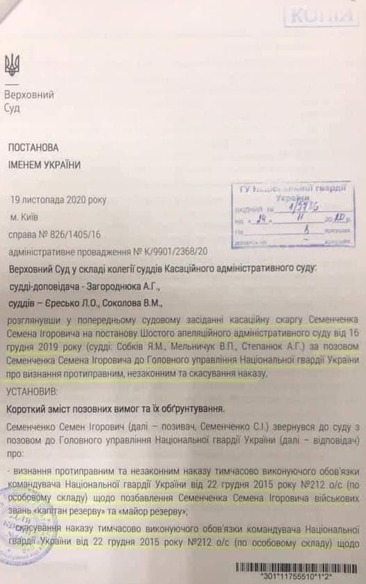 В документе указано, что Семенченко обратился с иском к Главному управлению Национальной гвардии Украины о признании противоправным и незаконным приказа временно исполняющего обязанности командующего НГУ от 22 декабря 2015 года о лишении его воинских званий "капитан резерва" и "майор резерва", а также об отмене приказа и.о. командующего НГУ от 22 декабря 2015 года о лишении его упомянутых воинских званий.