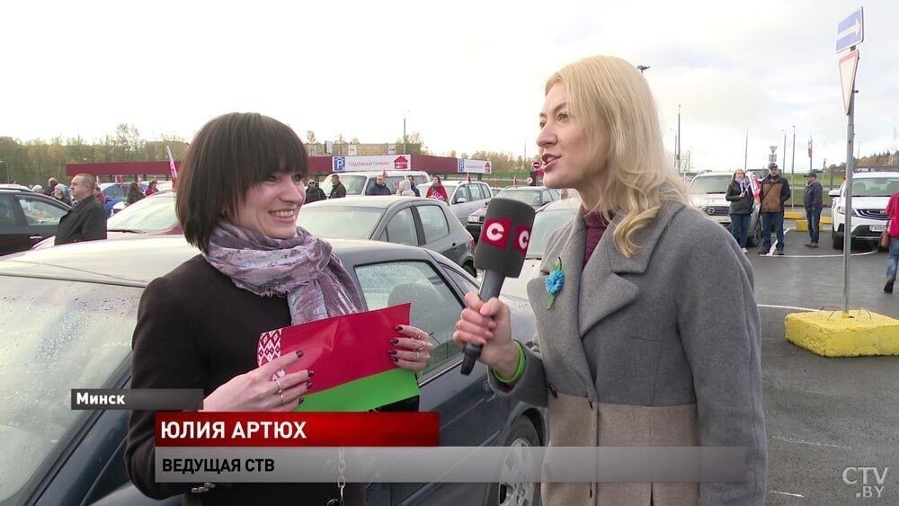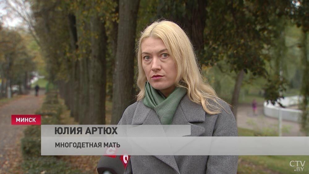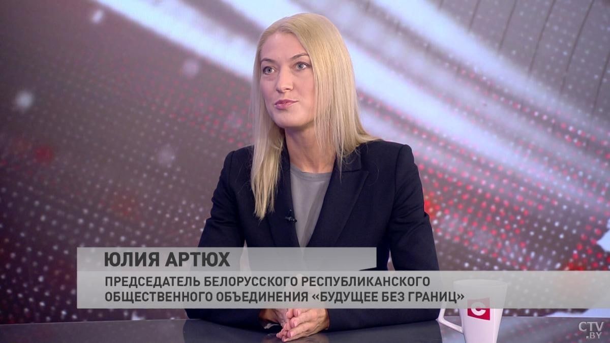 В сюжете показаны скриншоты из эфиров, в которых Артюх была участницей автопробега, председателем общественного объединения "Будущее без границ", многодетной матерью на женском форуме "За Беларусь" и женой офицера.