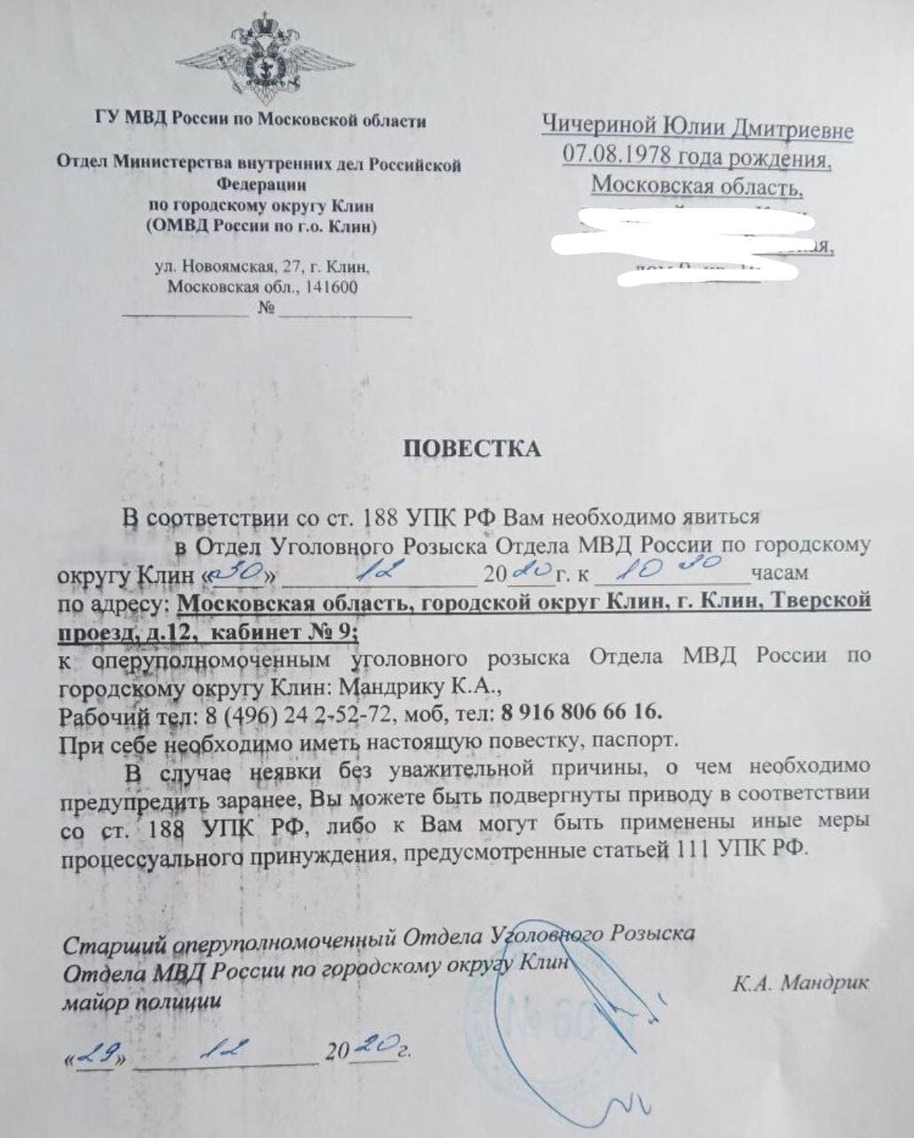 Чичерина отметила, что ее "вызывают на допросы и пугают статьями" уже не первый раз. Она высказала мнение, что в этом виноваты Навальный, либералы, Украина и даже США.