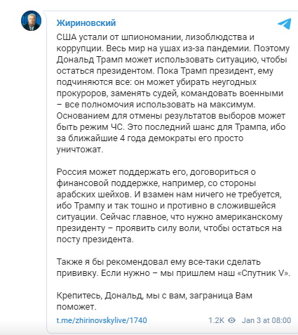Правда, Жириновский еще посоветовал Трампу привиться российской вакциной от коронавируса "Спутник V", не прошедшей еще третьей фазы испытаний.