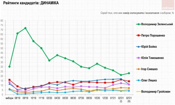 Примечательно, что по сравнению с предыдущими замерами рейтинг Зеленского начал расти, поддержка Порошенко снизилась. Свежее исследование группы "Рейтинг" также демонстрирует, как влияют санкции против Медведчука и группы подконтрольных ему каналов на электоральные настроения.