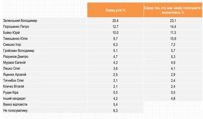 Зеленский оторвался от ближайшего преследователя Порошенко почти на 10%. На третьем вместе находится Юрий Бойко, четвертая – Юлия Тимошенко.