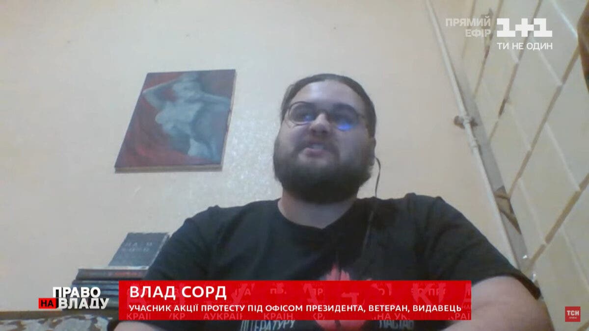 Она обратилась к ветерану АТО и издателю Владу Сорду (Стафийчуку), которого суд отправил под круглосуточный домашний арест и которого подозревают в том, что он выбил стекла в двери в ОП. Ведущая спросила, поступил бы он сейчас иначе или как и в тот раз пришел был на акцию.