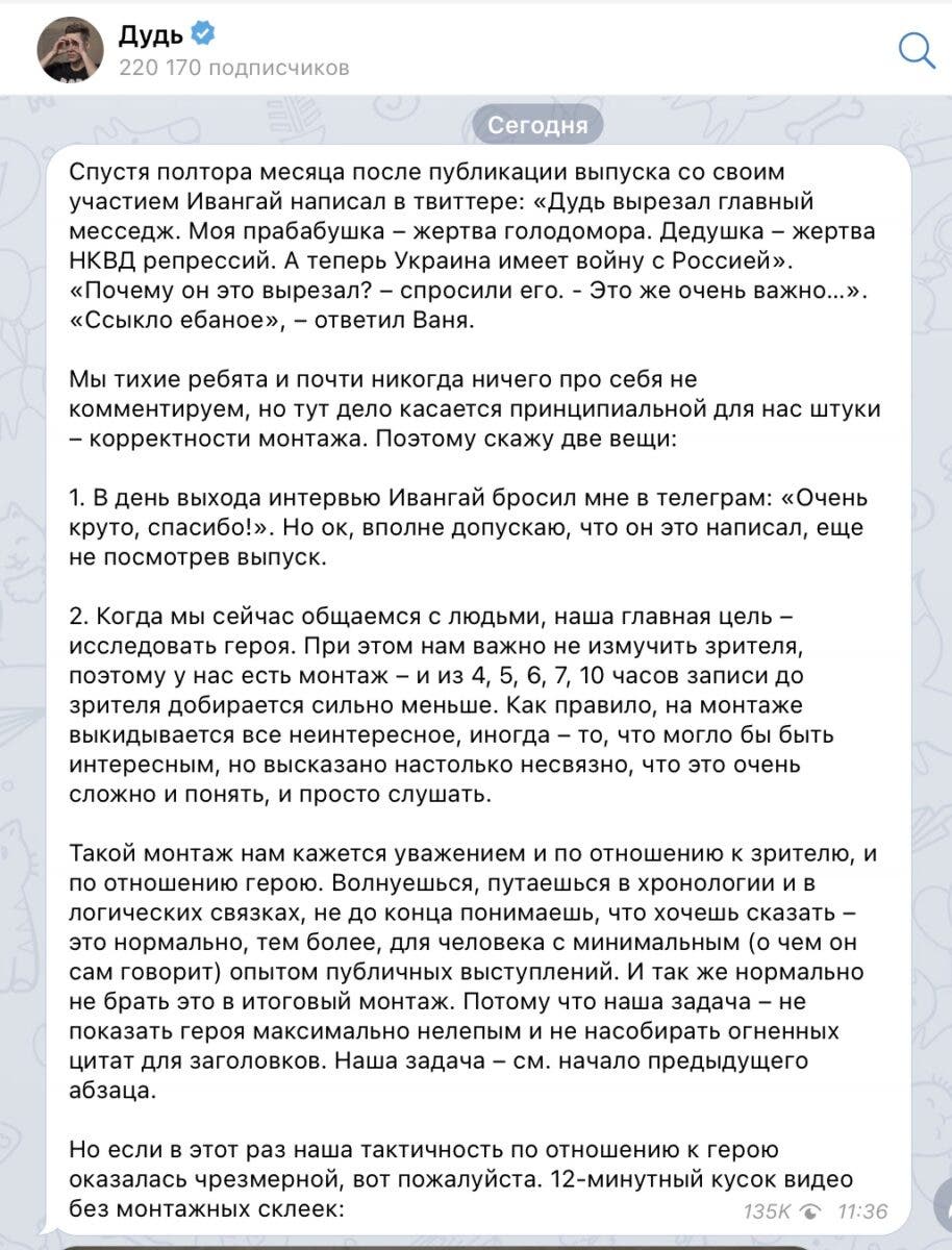 Дудь отметил, что спустя полтора месяца после публикации выпуска со своим участием Ивангай написал в Twitter: "Дудь вырезал главный месседж. Моя прабабушка – жертва голодомора. Дедушка – жертва НКВД репрессий. А теперь Украина имеет войну с Россией". "Почему он это вырезал?, – спросили его, – Это же очень важно…". "Ссыкло ебаное", – ответил Ваня.