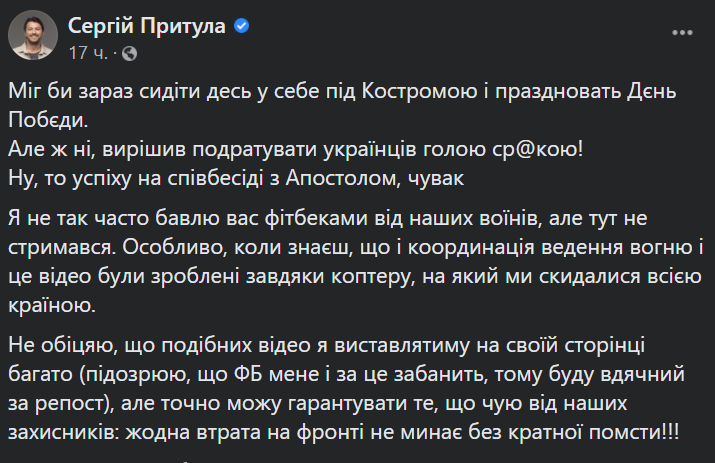 «Мог бы сейчас сидеть где-то у себя под Костромой и праздновать День Победы. Но нет, решил подразнить украинцев голой ср * кой!», — подписал видео Притула.