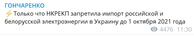 [/center]Украина запретила импорт российской и белорусской электроэнергии до 1 октября 2021 года. Соответствующее решение было принято на заседании Национальной комиссии, осуществляющей государственное регулирование в сферах энергетики и коммунальных услуг.