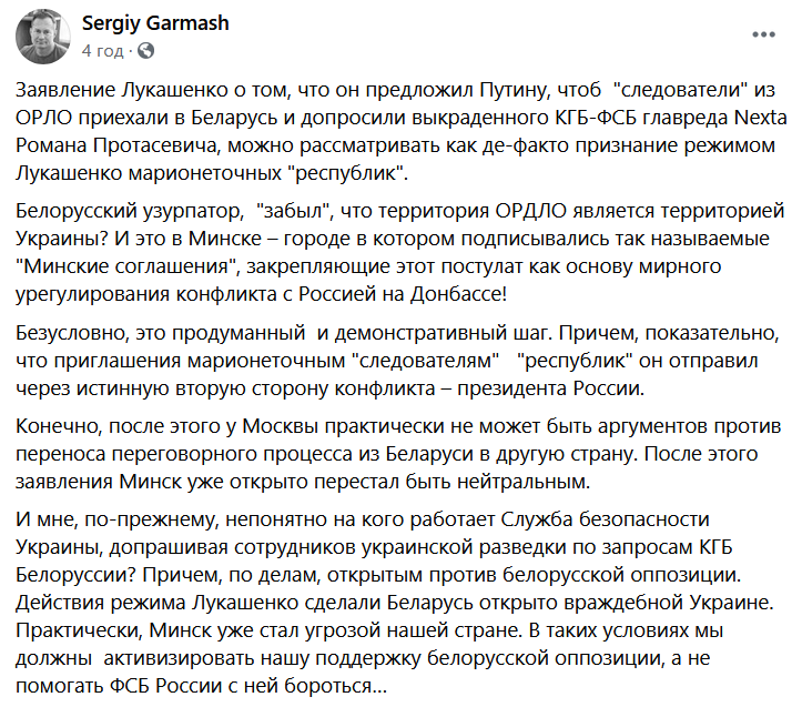 Как написал в Facebook член украинской делегации в Трехсторонней контактной группе Сергей Гармаш, показательно, что приглашения следователям "республик" Лукашенко отправил через истинную вторую сторону конфликта на Донбассе – президента России Владимира Путина.