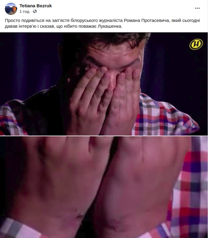 Вот эти руки - это полностью уничтожает всю достоверность всего того, что сейчас извергают в телеэфире, все те слова, которые сейчас заставляют произнести Романа. За это интервью надо вводить против Лукашенко и его банды дополнительные санкции", - написал украинский журналист Юрий Бутусов.