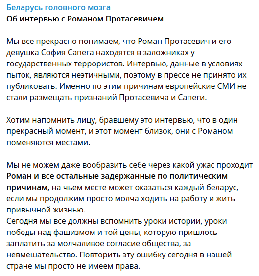 Его "признания" телеканалу ОНТ, говорят, что они сделаны Протасевичем после пыток.