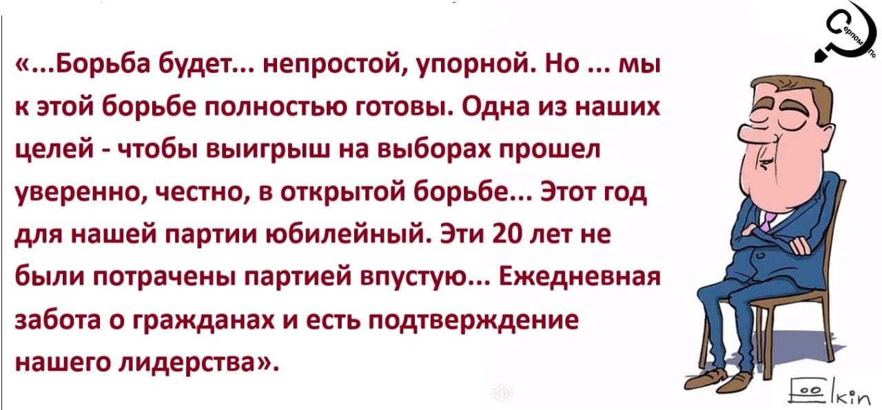 Одна проблема – не знаешь, в каком месте громче смеяться, там, где Медведев рассуждает о небывальщине – честной борьбе и честной победе на выборах, или, когда вещает о ежедневной заботе партии жуликов и воров о гражданах.