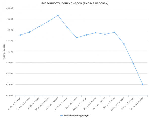 С 1 января 2019 года по 1 апреля 2021 года пенсионеров в стране стало меньше на 1,276 миллиона человек - рекордную величину за всю историю доступной статистики (с 1998 года).