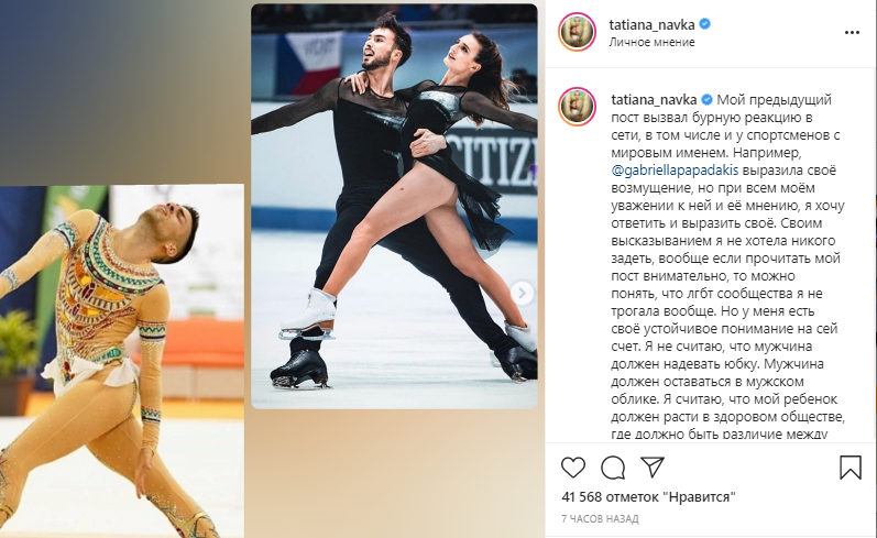 Столкнувшись с критикой, Навка опубликовала еще один пост, в котором заявила, что не хотела никого обидеть. Тем не менее, она отметила, что все равно остается при мнении, что "мужчина не должен надевать юбку".