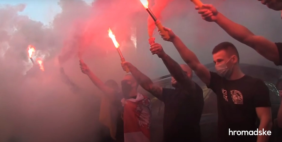 Протестующие также зажгли файеры под посольством Беларуси. Участники акции в завершение скандировали: "Жыве Беларусь!", "Слава Украине! - Героям Слава!", "Слава нации! - Смерть врагам!".