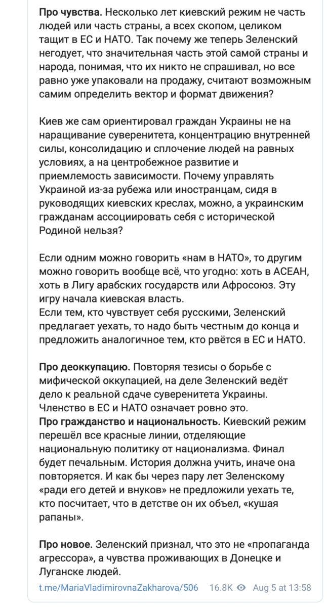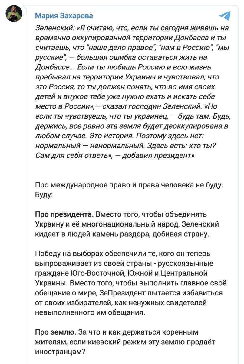 Кроме того, Захарова заявила, что если президент Украины предлагает уехать «тем, кто чувствует себя русскими», то с его стороны было бы честным «предложить аналогичное тем, кто рвется в ЕС и НАТО».