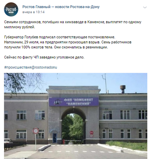 А вот тема, сколько получат родственники погибших, вызвала бурное обсуждение у ростовчан. Семьям сотрудников, погибших на химзаводе в Каменске, выплатят по одному миллиону рублей, такое постановление подписал губернатор области.